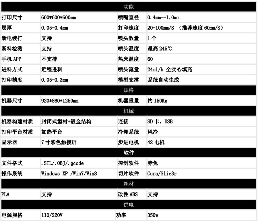 FDM 6060 智能3D打印机具有高效的打印速度和高打印精度,打印速度在 20-100mm/s 之间调整 (推荐速度为 30-60mm/s),支持平台热床温度0-60℃,热嘴最高温支持245℃,喷嘴直径0.4-1.0MM,打印精度达到 0.05-0.4mm。支持多种打印材料ABS、PLA 等,主要用于打印医疗脊柱固定支具,关节固定类护具系列等。 支持 Windows XP、Win7、Win8 系统等操作系统,更加方便用户操作,达到快速定制化